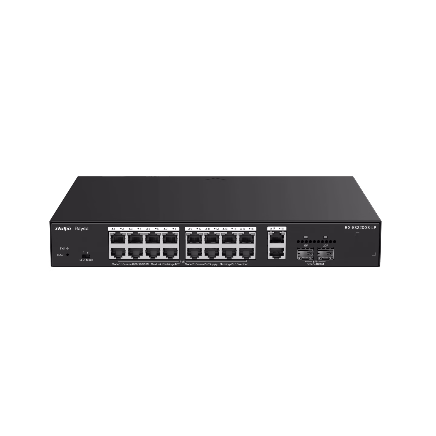 The Ruijie Reyee RG-ES220GS-LP Smart Cloud Managed PoE Switch supports 130W and IEEE 802.3at/802.3af PoE. It features 16 × 1G RJ45 PoE+ ports, 2 × 1G RJ45 ports, and 2 × 1G SFP ports.